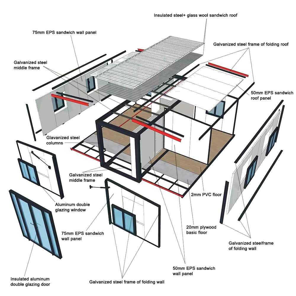 75mm rock wool sandwich (Class A non-combustible) + 9mm bamboo-fibre interior + 16mm metal-clad exterior. Will not burn.